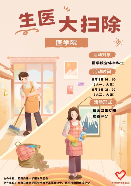 青年志愿者协会详细介绍了打扫寝室的重要意义及相关注意事项。此次寝室大扫除不仅有助于强化同学们的劳动意识,引导大家崇尚劳动,热爱劳动,尊重劳动;更有助于培养同学们的卫生习惯与集体观念,为同学们创造一个更为舒适的学习和生活环境。此外,“生医大扫除”活动将成为制服诱惑