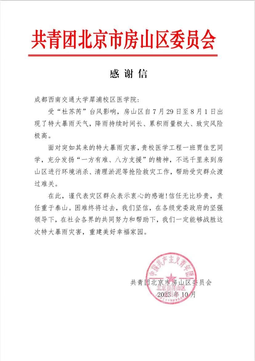 房山区委员会信中写到:“面对突如其来的特大暴雨灾害,贵校生物医学工程一班贾佳艺同学,充分发扬“一方有难、八方支援”的精神,不远千里来到房山区进行环境消杀、清理淤泥等抢险救灾工作,帮助受灾群众渡过难关”。