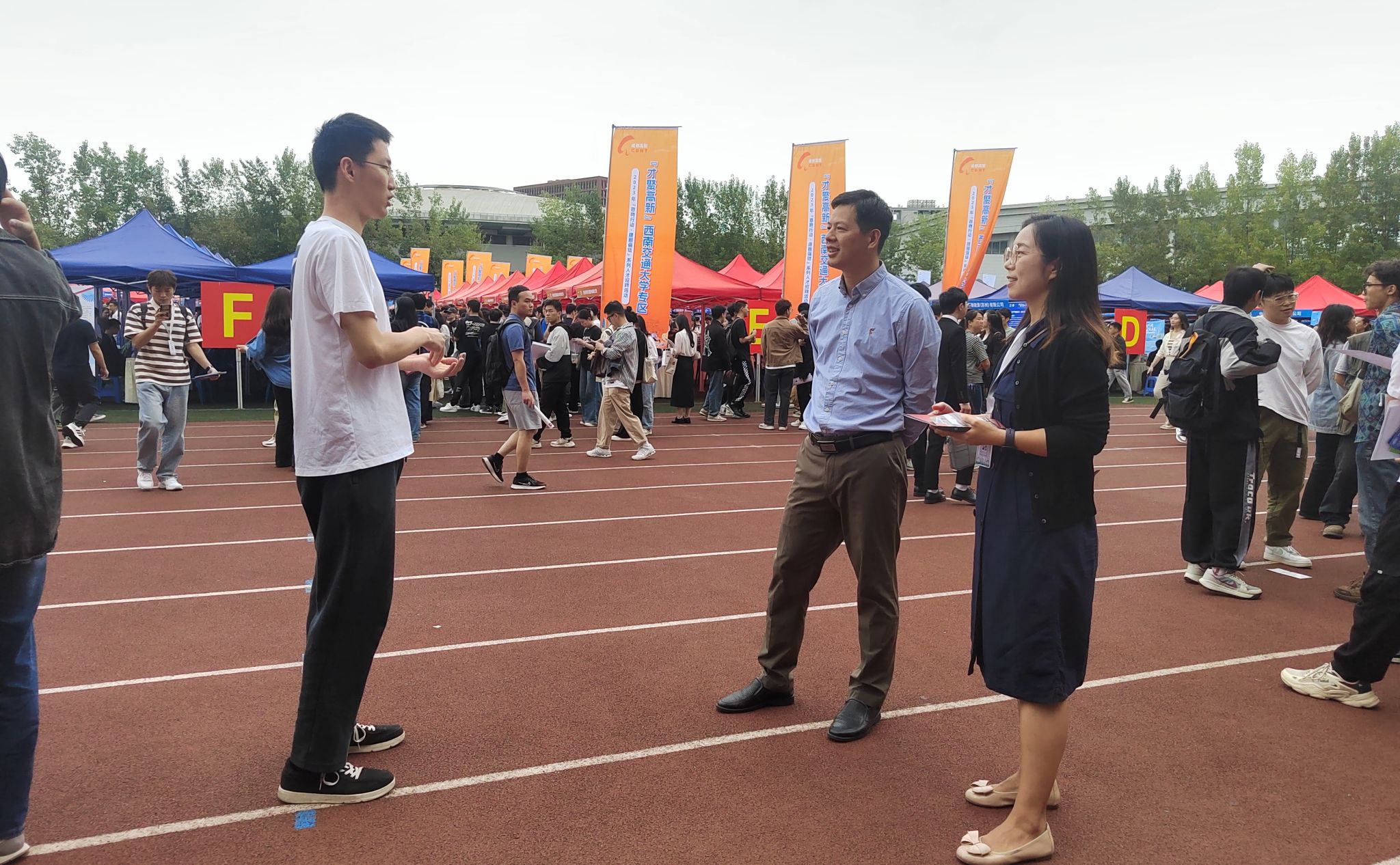 2024届秋季大型双选会在犀浦校区北区体育场举行,500余家企业参会招聘学生。学院党委书记李锦红亲自到双选会现场,为毕业生就业加油打气。