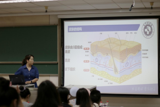 王骏老师首先通过区分皮肤的属性(干性、油性、混合性、敏感性和中性)对各类皮肤的优缺点进行了总结。在对肤质有了基本了解的基础上,王骏老师详细地讲述了护肤的流程,简要介绍了医院常用的医学美容仪器,并强调了护肤过程中的注意事项。通过王老师生动的讲述,师生们对于科学护肤有了更进一步的了解。