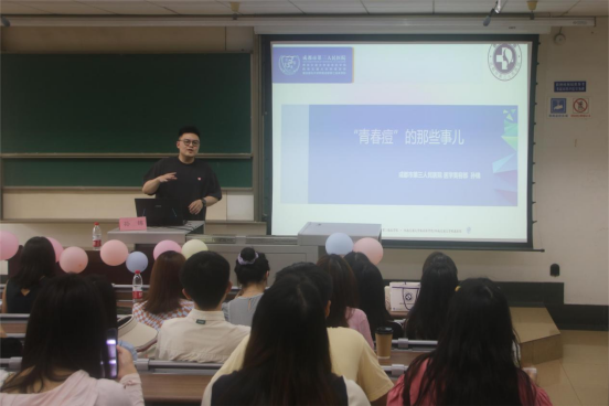 附属医院(成都市第三人民医院)医学美容部王骏老师和孙锦老师,他们分别围绕皮肤护理和青春痘防治为师生们进行了生动的知识科普。