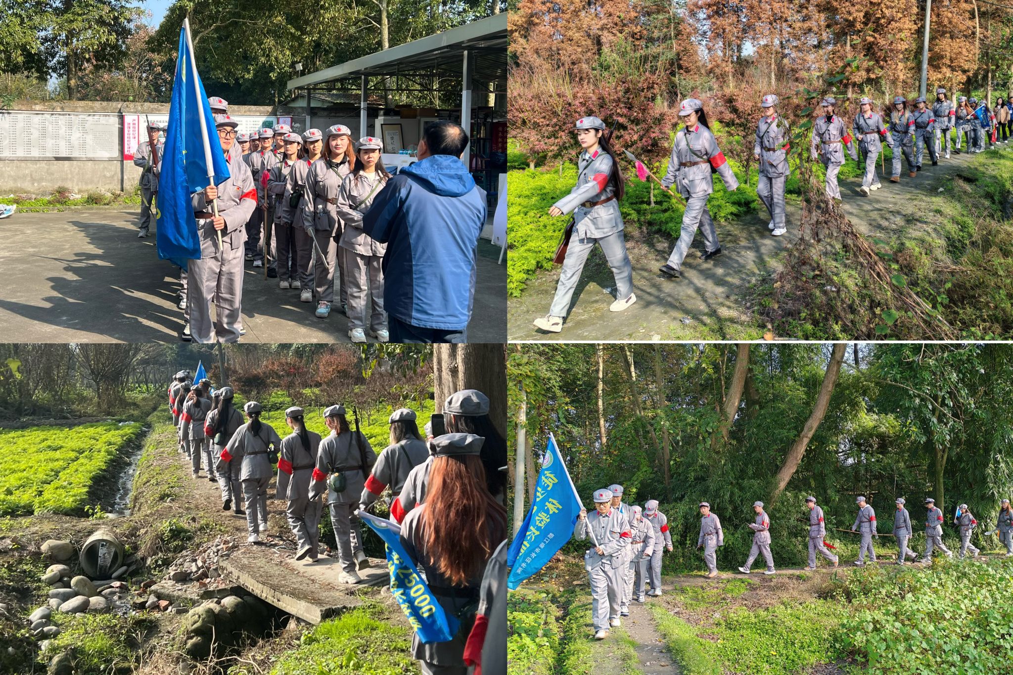 活动当天,大家穿上了红军服装,沿着模拟的路线重走2500米小长征,实地体验了长征路的艰辛与不易。随着一声响亮的号角,重走2500米小长征的活动正式拉开序幕。队伍沿着精心设计的模拟路线行进,这条路线不仅复刻了长征路上的部分地形特征,如蜿蜒的山路、陡峭的斜坡、泥泞的草地,还巧妙地融入了历史事件的节点,如飞夺泸定桥、过雪山草地的情景再现,让参与者仿佛亲身经历那段波澜壮阔的历史。这一环节不仅让大家更加直观地感受到了长征的艰难困苦,也对长征精神有了更加深刻的理解和感悟。