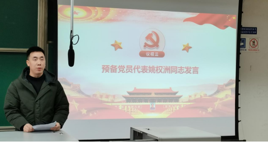 议程第三项,预备党员代表姚权洲同志发言。他首先从自己参军入伍期间的亲身经历出发讲述了自身明确入党动机、坚定入党信念的心路历程。接着回顾了一百多年以来,在中国共产党的团结带领下,中华民族和中国人民迎来了从站起来、富起来到强起来的伟大转变。他表示,党员不仅是一种身份,更是一种责任,要向无数党员前辈学习,尽自己所能地为人民服务。最后,他代表全体新预备党员向党组织做出了庄严承诺:我们努力加强党性修养,树立正确的世界观、人生观和价值观,把个人理想融入到党和国家事业中,同时不断加深对党的路线、方针、政策的认识和理解,改正自身的缺点和不足,更会遵守医学生誓言,贡献自己的智慧和青春,无愧中国共产党党员的称号。