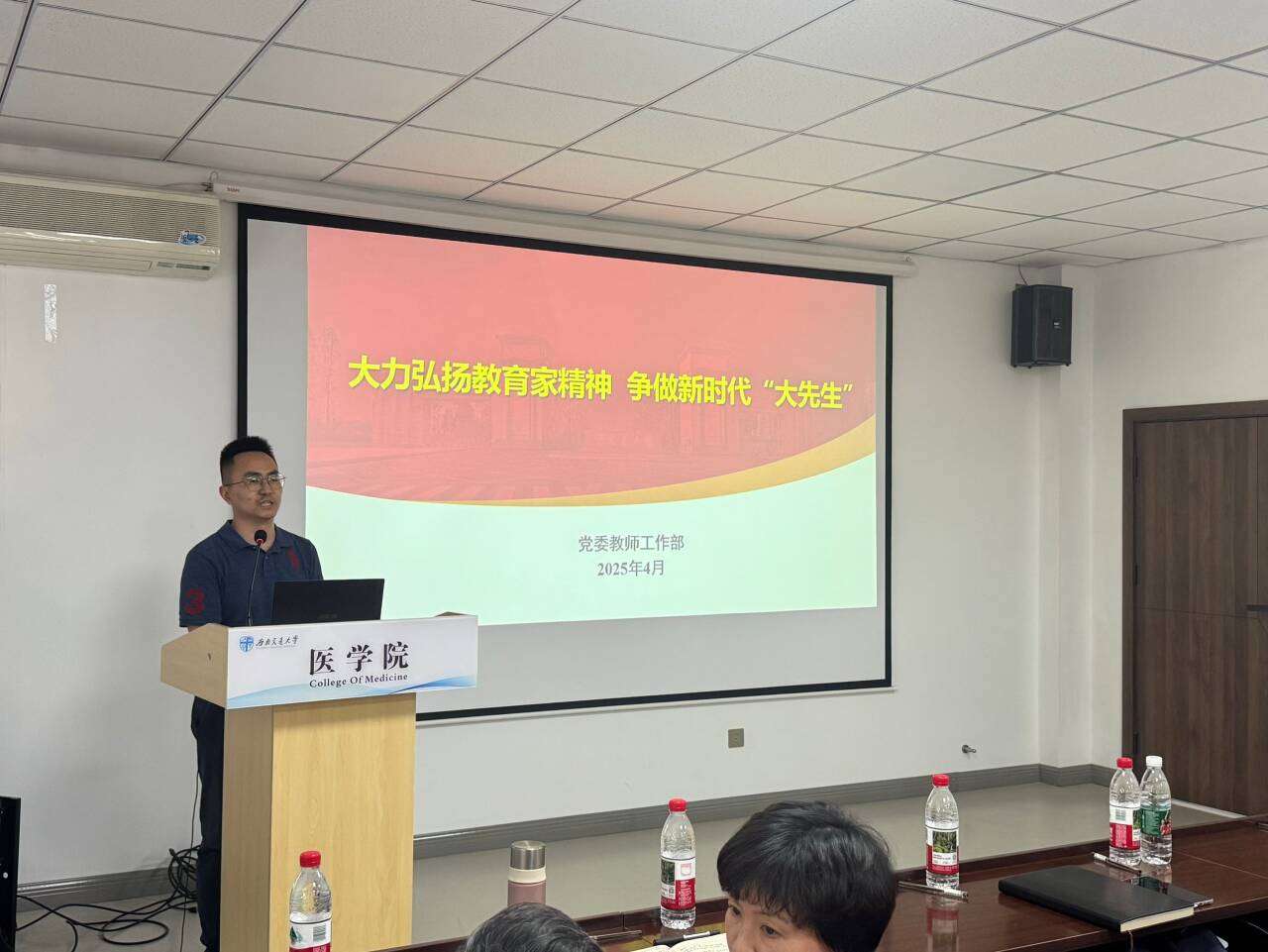 党委书记曾东红主持大会第一阶段,以“弘扬教育家精神”为开篇,党委教师工作部崔健科长围绕《大力弘扬教育家精神 争做新时代“大先生”》主题,通过钱学森、黄大年等教育家的典型事迹,号召全体教师坚守“为党育人、为国育才”初心,以“高线”铸师魂、以“标线”立规范、以“红线”明底线,勇担强国使命。