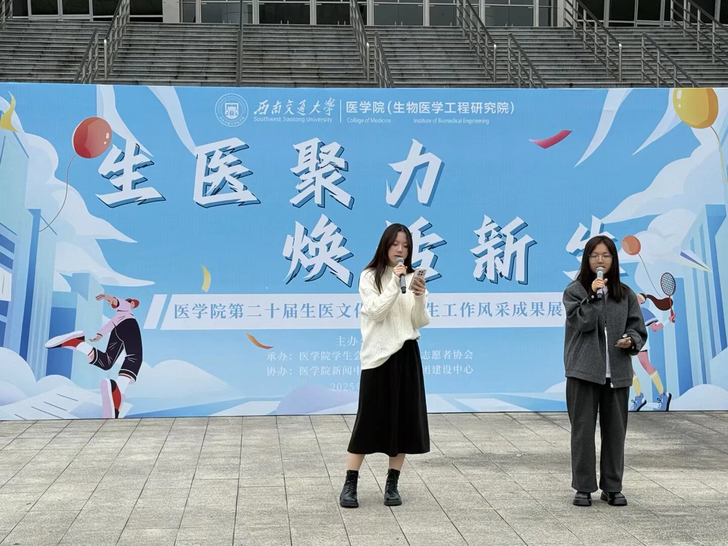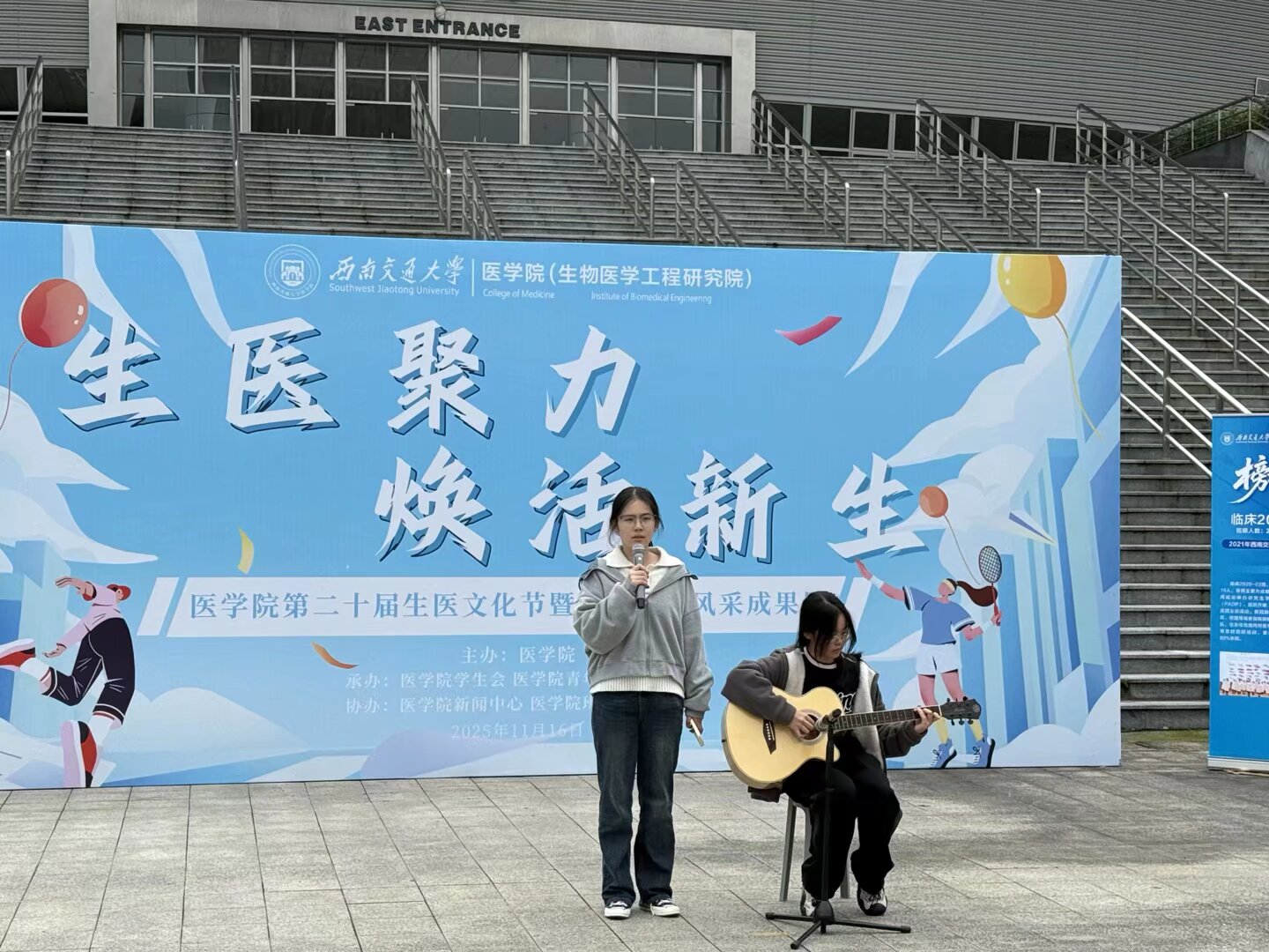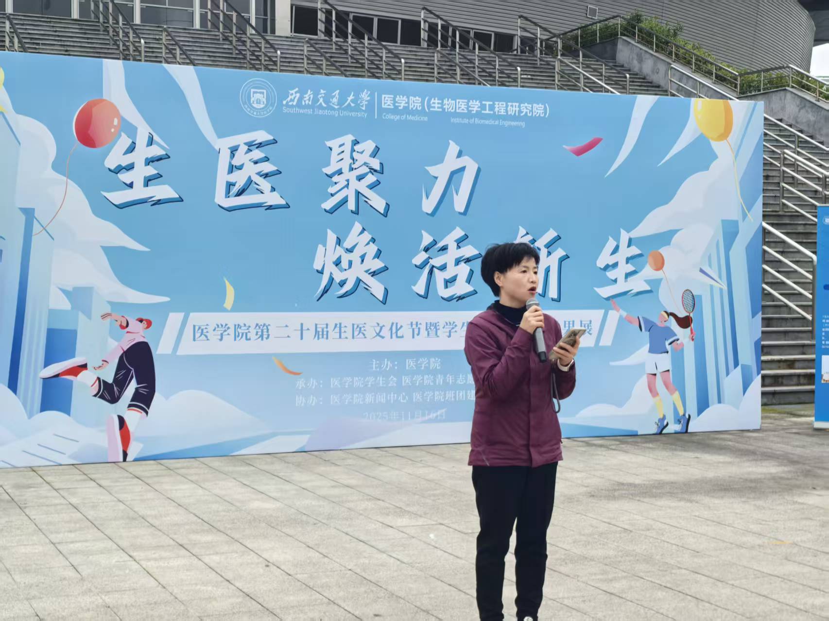 2025年11月16日,制服诱惑 “生医聚力,焕活新生”第二十届生医文化节暨学生工作风采成果展于犀浦校区飞碟体育场东入口成功举办。制服诱惑 党委书记曾东红、党委副书记于楠、生医系主任向韬、团委书记胡豪及辅导员靳涵廖柯琳以及八十余名生医学子出席本次活动。本次文化节谨遵“五育并举,立德树人”的教育方针,展示了制服诱惑 学生风采,增进了师生感情。这不仅是一场属于医学学子的节日庆典,更是一次传统文化与现代精神交融共生的生动实践。 本次活动在同学们悠扬的歌声中拉开序幕