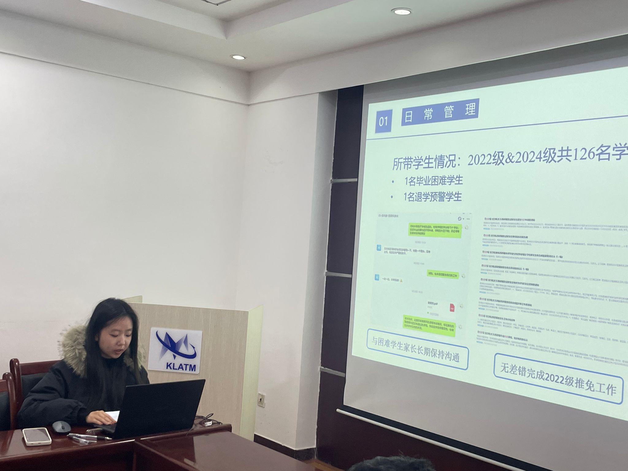 会上,学工组副组长胡豪、专职辅导员靳涵、免研辅导员廖柯琳、兼职辅导员韩鹏飞依次作述职报告。各位辅导员紧扣思想理论教育与价值引领、党团及班级建设、学业指导与学风建设、日常事务管理、心理健康教育咨询、职业规划与就业创业指导等核心职责,全面总结了过去一年的工作内容、显著成效,分享了育人经验与成长感悟,深刻剖析了工作中存在的不足,并明确了下一步的改进方向与工作思路。
