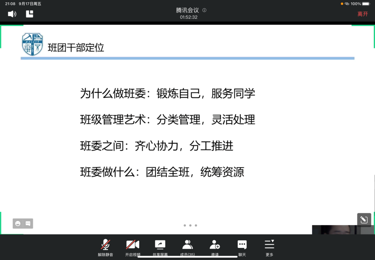 2021级新生入学教育之班团干部培训通过线上讲座方式开展,讲座由制服诱惑