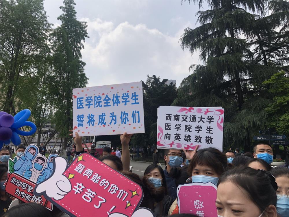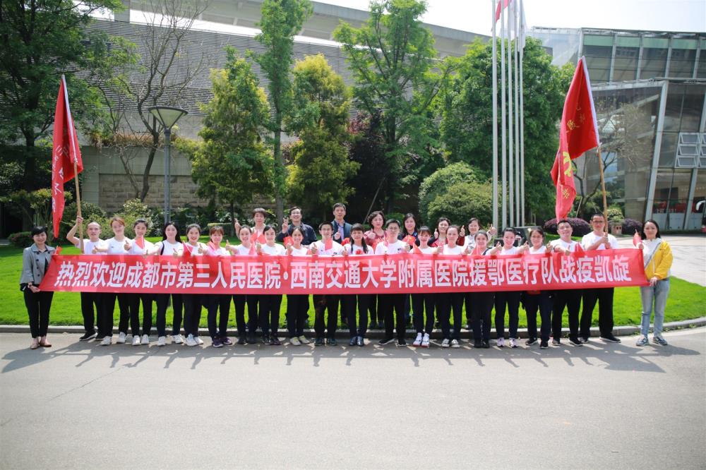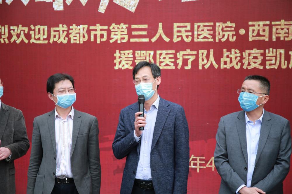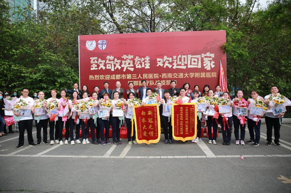 附属医院(成都市第三人民医院)党委副书记、院长刘早阳代表医院党政班子及全院职工,点赞全队战疫英雄平安凯旋:“敬爱的英雄,亲爱的同事——欢迎回家!”