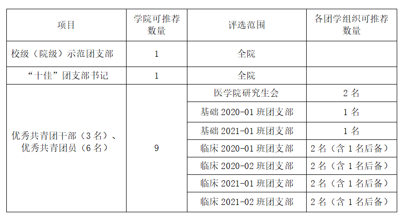 校级(院级)示范团支部、“十佳”团支部书记、优秀共青团干部、优秀共青团员。