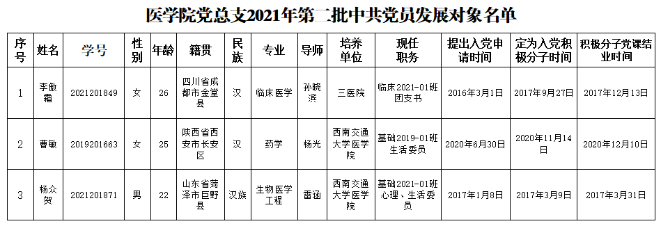 经群众意见征集、党支部委员会讨论、制服诱惑 党总支委员会会议审批,现将制服诱惑 党总支2021年第二批发展对象名单公示如下: