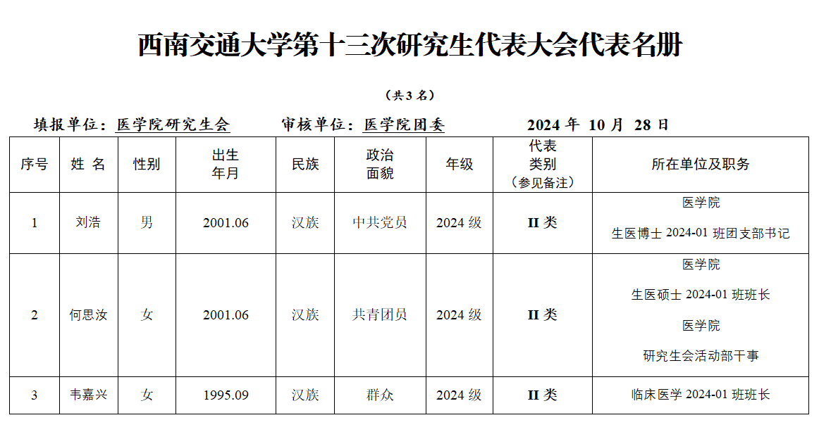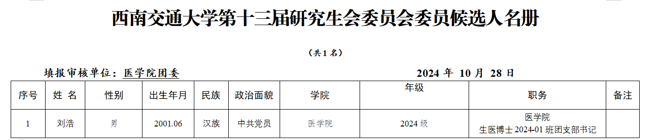 第十三次研究生代表大会筹备工作的预通知》,经班级(团支部)推荐,充分酝酿,共选举出研究生代表3名;经学院团组织提名,经班级(团支部)推荐,学院团组织考察,推选出研究生委员会委员候选人1名。现将代表选举结果、委员候选人推举结果公示如下,公示期2024年10月28日-10月31日,如有异议,请于2024年10月31日17:00前至制服诱惑