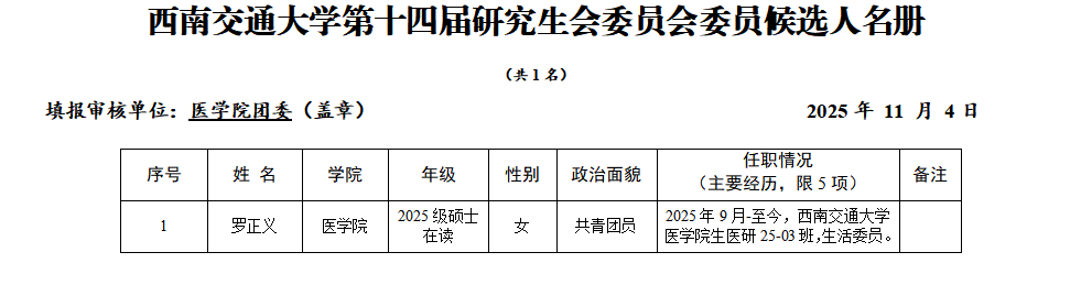 第十四次研究生代表大会筹备工作的预通知》,经班级(团支部)推荐,充分酝酿,共选举出研究生代表3名;经学院团组织提名,经班级(团支部)推荐,学院团组织考察,推选出研究生委员会委员候选人1名。现将代表选举结果、委员候选人推举结果公示如下,公示期2025年11月4日-11月7日,如有异议,请于2025年11月7日17:00前至制服诱惑