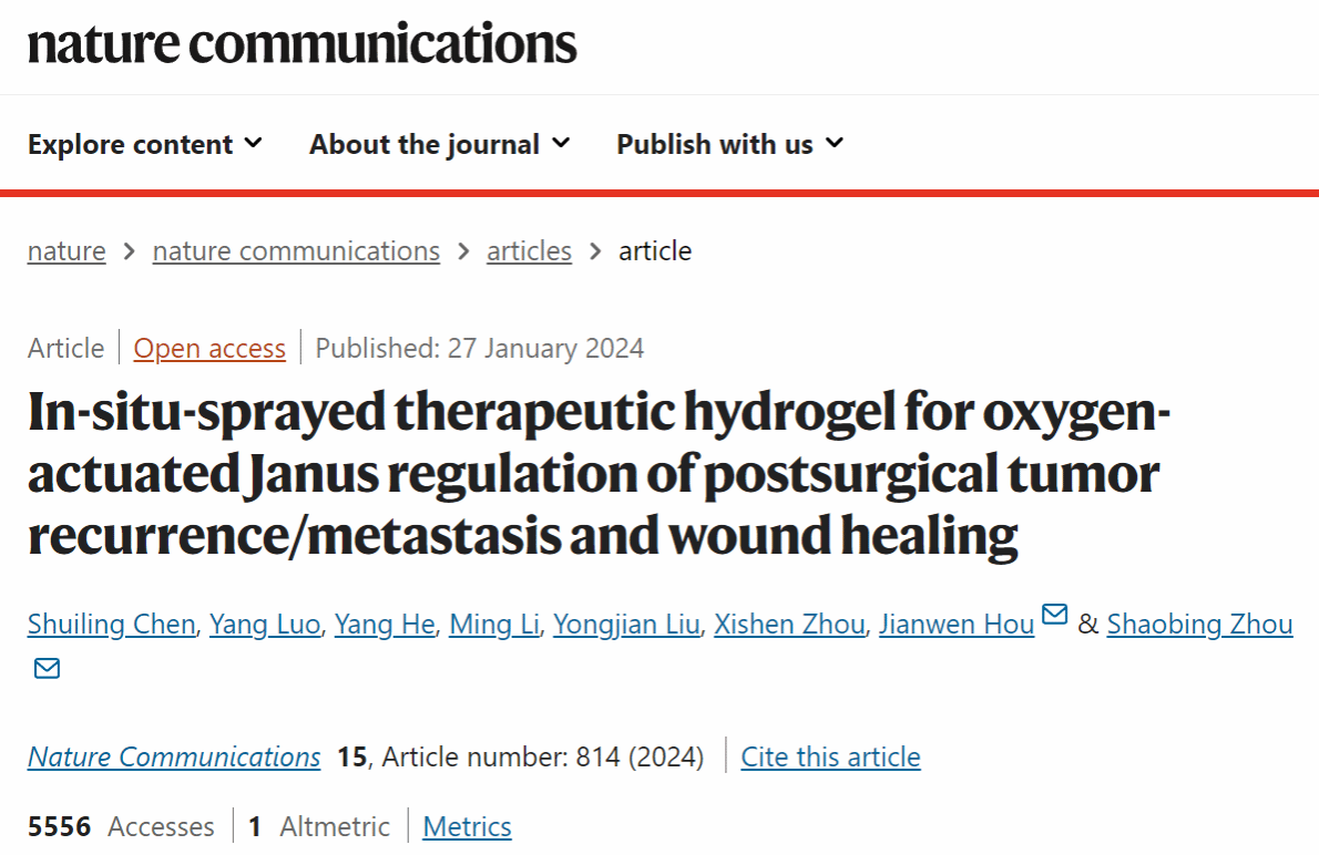 周绍兵教授团队侯建文副教授等人在肿瘤术后辅助治疗领域取得重要进展,相关研究成果以“In-situ-sprayed therapeutic hydrogel for oxygen-actuated Janus regulation of postsurgical tumor recurrence/metastasis and wound healing”为题发表在国际权威期刊《Nature Communications》上,并被期刊编辑部选入“材料科学与化学”(Materials science and chemistry)领域亮点推荐(Editors’ Highlights)文章。该专栏旨在精选近期发表在该领域的少数最具突破性和影响力的论文作为亮点向读者重点推荐。论文第一单位为制服诱惑