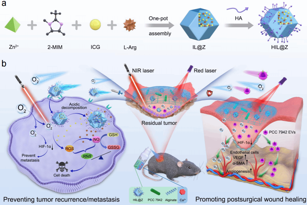 黑色素瘤是一种致死率和转移率极高的恶性肿瘤,目前临床上最常见的治疗方法是手术切除。然而,手术并不能保证全部的肿瘤组织被切除干净,边缘残留的肿瘤细胞容易引起原位复发。此外,术后部位的乏氧环境会促进残留的肿瘤发生远端转移,并使伤口一直处于炎症状态阻碍其愈合,严重威胁患者的生命安全和术后生存质量。为了降低残留肿瘤转移复发的风险和促进术后创面的快速愈合,临床上多采用放/化疗和高压氧作为辅助治疗手段。然而,这些方法的治疗效果并不理想且均存在一定的毒副作用。因此,亟需发展新型的术后辅助治疗手段以提高患者的治愈率和恢复质量。针对上述问题,周绍兵教授/侯建文副教授团队利用微藻作为天然的供氧单元,构建了可喷雾成型的微藻基自产氧活性水凝胶(图1)。微藻光合作用产生的氧气可以有效改善肿瘤细胞内的乏氧环境,分别通过增敏纳米药物的光动力治疗和下调缺氧诱导因子水平,达到抑制肿瘤细胞复发转移的目的。与此同时,微藻产生的氧气和分泌的胞外囊泡共同促进伤口处新生血管的形成,有效加速创面的愈合过程。活体实验结果表明,水凝胶治疗组小鼠的生存率和伤口闭合率分别高达80%和99%(图2)。该研究工作为开发兼具肿瘤治疗和组织修复功能的活性生物材料提供了新的研究思路。