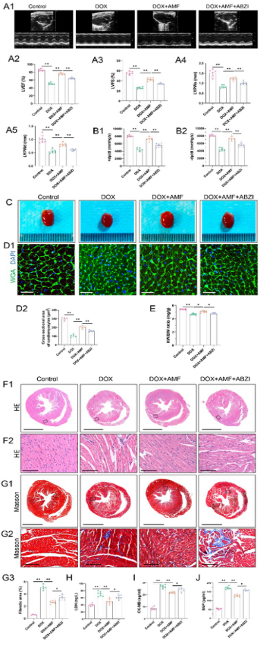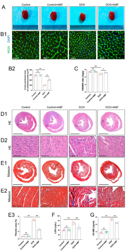 首先作者发现AMF能改善阿霉素导致的小鼠心衰、提高小鼠生存率,且呈剂量依赖性。随后作者进一步对小鼠心肌损伤进行评估,发现AMF显著改善了由阿霉素诱发的心肌细胞萎缩、心肌纤维紊乱及丢失以及心肌纤维化的程度。