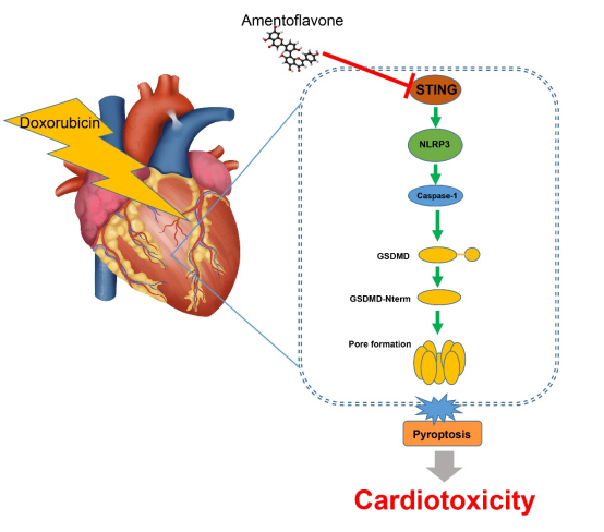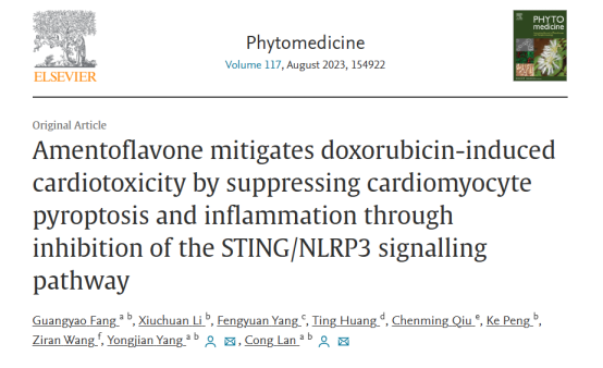 2021级在读硕士研究生方光耀以第一作者在国际权威期刊 Phytomedicine(中科院1区,top)发表了题为“Amentoflavone mitigates doxorubicin-induced cardiotoxicity by suppressing cardiomyocyte pyroptosis and inflammation through inhibition of the STING/NLRP3 signalling pathway”的最新研究成果。这项研究工作揭示了Amentoflavone(AMF) 通过抑制心肌细胞焦亡和炎症来改善阿霉素诱发心肌损伤和心力衰竭。制服诱惑