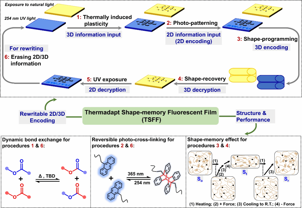 周绍兵教授/谢辉副教授团队受到能够通过改变颜色和形状进行伪装的拟态章鱼的启发,开发了一种具有可逆荧光转变和热适性的形状记忆高分子材料,不仅实现了二维加密和三维加密的集成,还利用光可逆和热适性实现了信息的反复书写(图1和图2)。