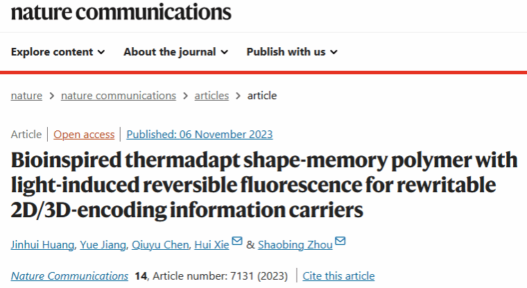 (生物医学工程研究院)周绍兵教授团队谢辉副教授在智能动态软材料研究中取得最新进展。谢辉副教授是我校软物质创新团队的骨干成员。相关研究成果以“Bioinspired thermadapt shape-memory polymer with light-induced reversible fluorescence for rewritable 2D/3D-encoding information carriers”为题,发表在国际综合性期刊《Nature Communications》上,论文的第一作者为制服诱惑