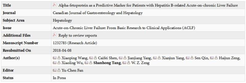 2017级硕士研究生王孝平(导师:成都军区总医院消化内科汤善宏副教授),依据临床实践中发现血清甲胎蛋白表达水平较高的乙肝相关的慢加急性肝衰竭患者预后价值,撰写的学术论著文“Alpha-fetoprotein as a Predictive Marker for Patients with Hepatitis B-related Acute-on-chronic Liver Failure”被消化专业国际知名杂志《Canadian Journal of Gastroenterology and Hepatology》接收发表。