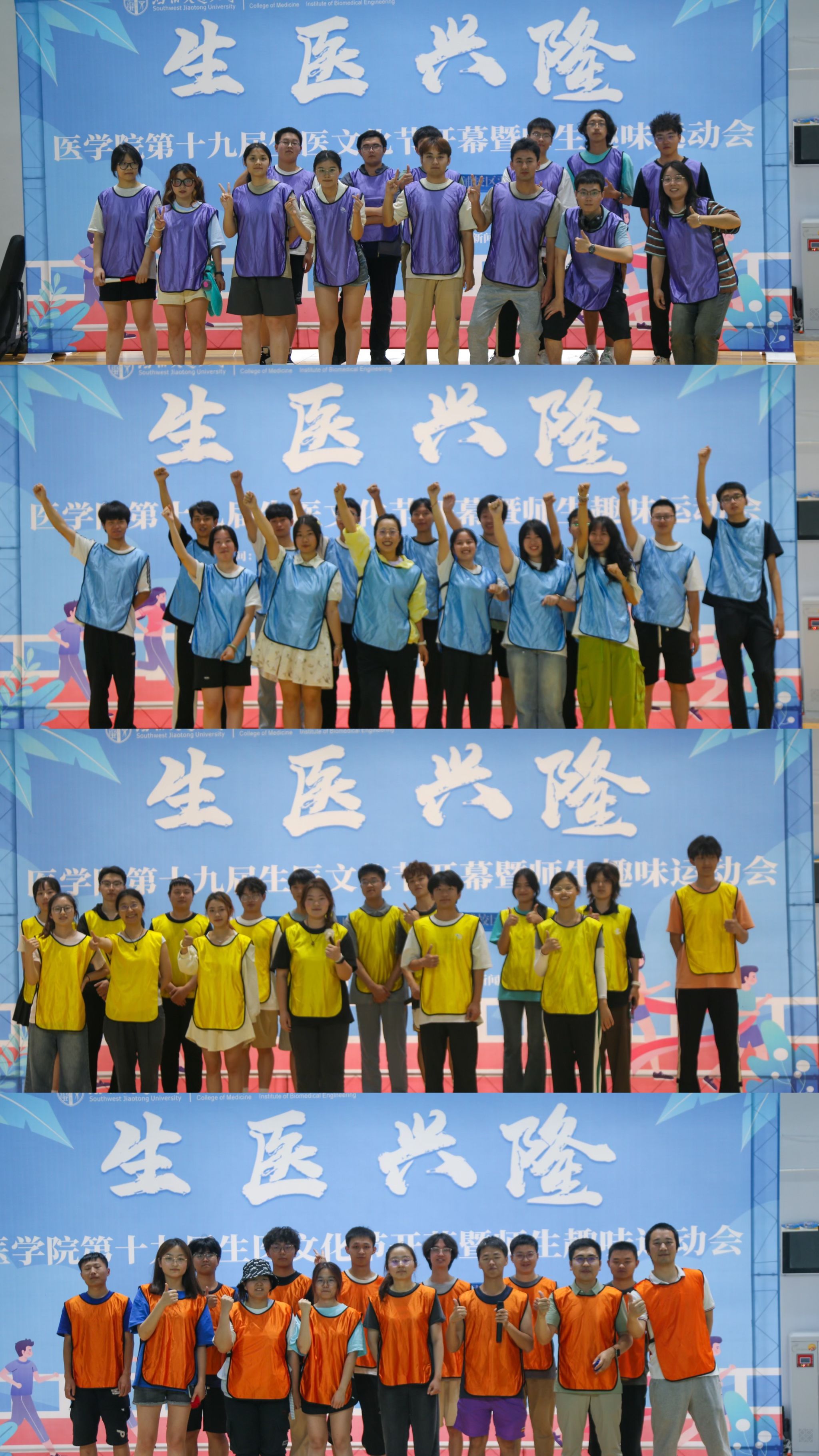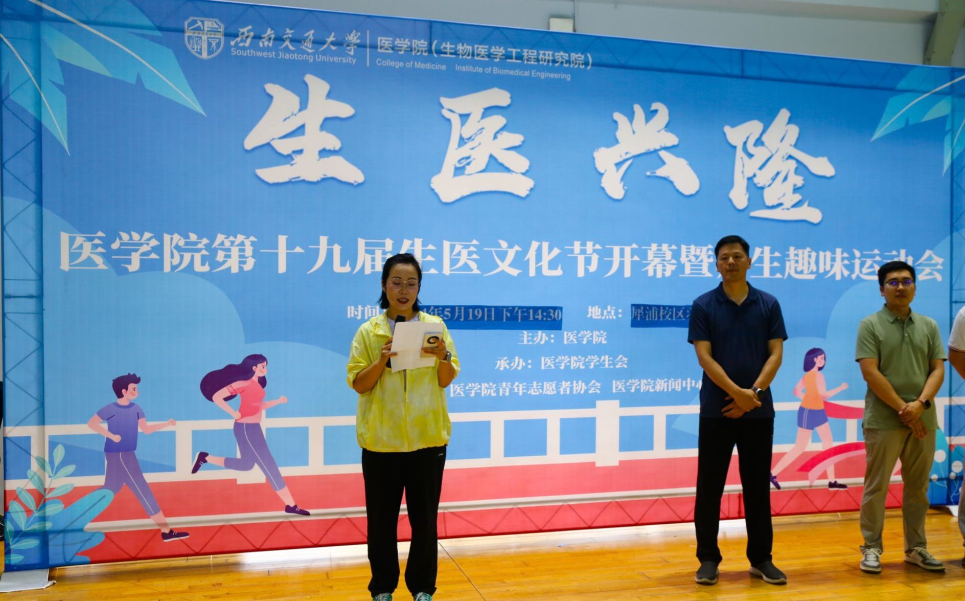 学生风采,促进了师生交流,增进了师生感情。生医文化节开幕式在犀浦校区羽毛球馆隆重举行,,学院党委书记李锦红、党委副书记于楠、生医系主任向韬、团委书记胡豪、学院教师智伟、以及辅导员靳涵、王川玲、张佳豪出席本次活动。