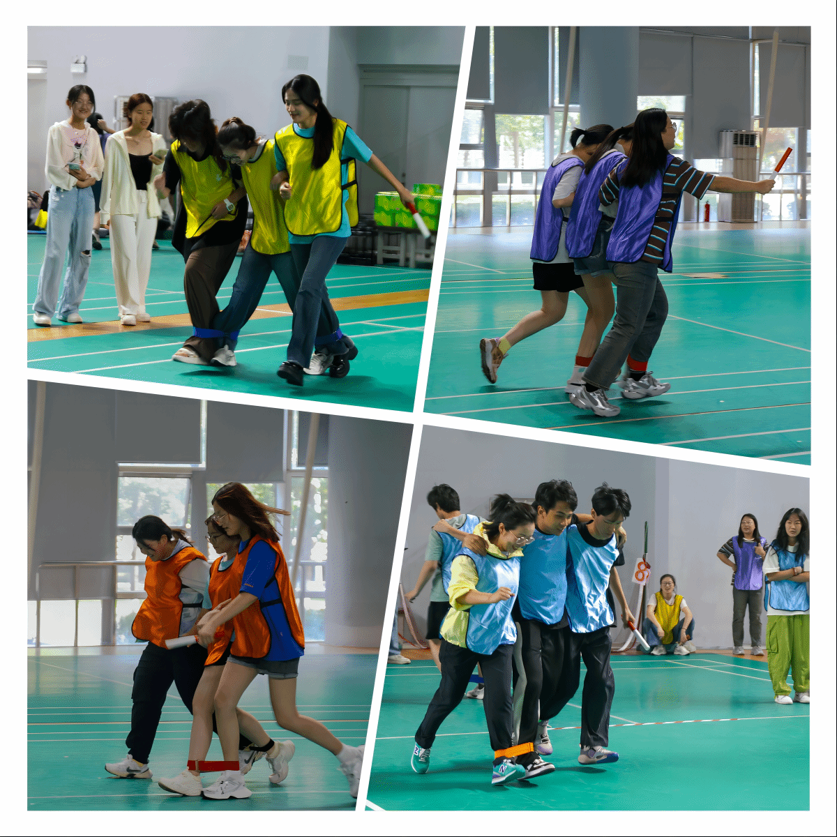 接下来是“三人四足”游戏,每队选出三名队员,他们的相邻腿需要绑在一起,然后一起向前奔跑。这个游戏要求队员们步调一致、紧密配合,不仅考验了他们的协作能力,也展现了他们的智慧和技巧。