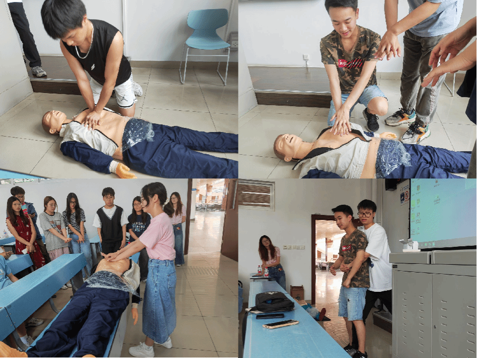 临床医学专业学生王森林、李林峰、张紫鑫、罗丹,以心肺复苏(cardiopulmonary resuscitation, CPR)和海姆立克法(Heimlich Maneuver)为主要内容为学员们进行知识讲解和模拟操作,旨在通过理论与实践相结合的方式,让学员们掌握有效的急救方法。
