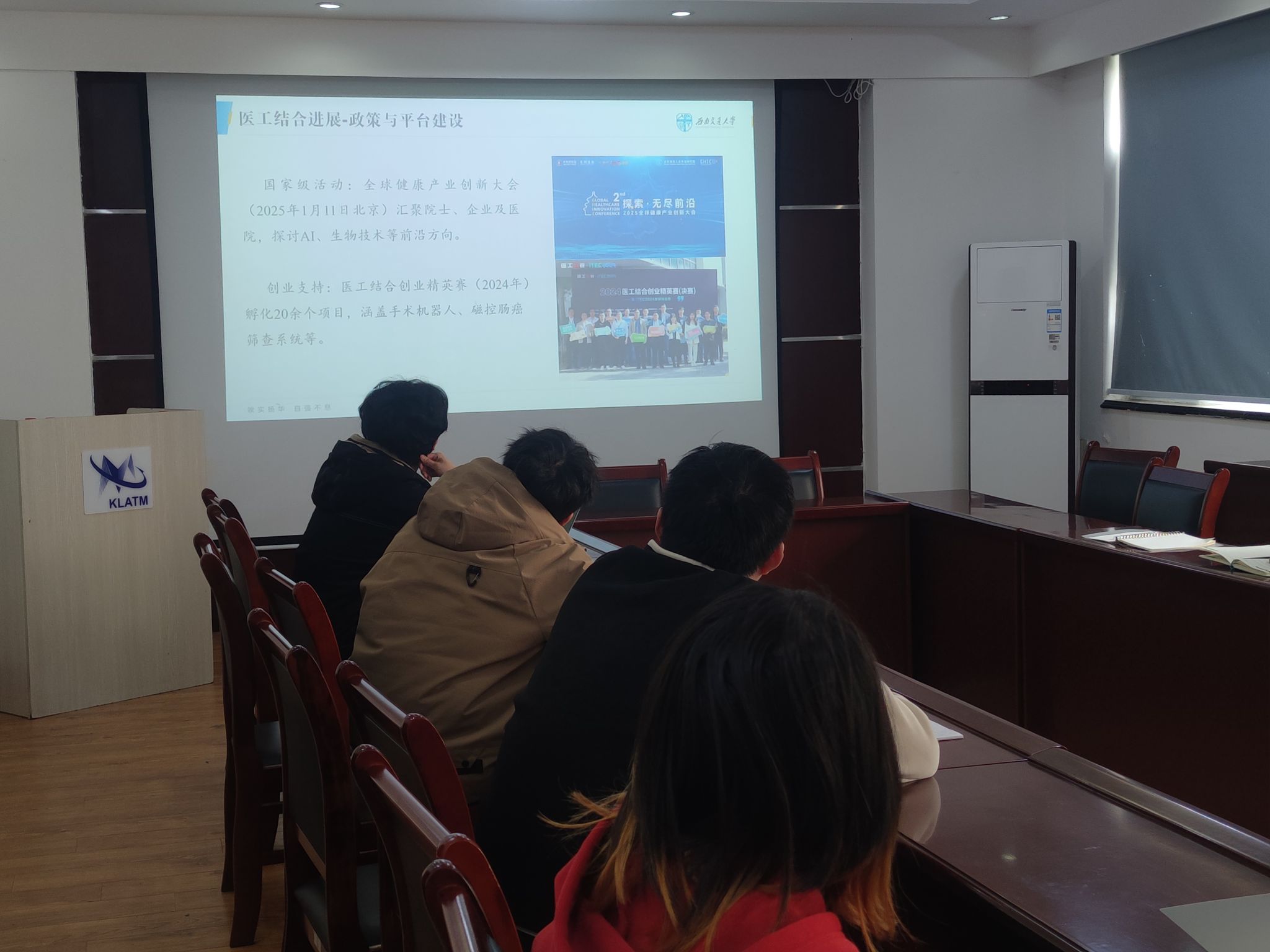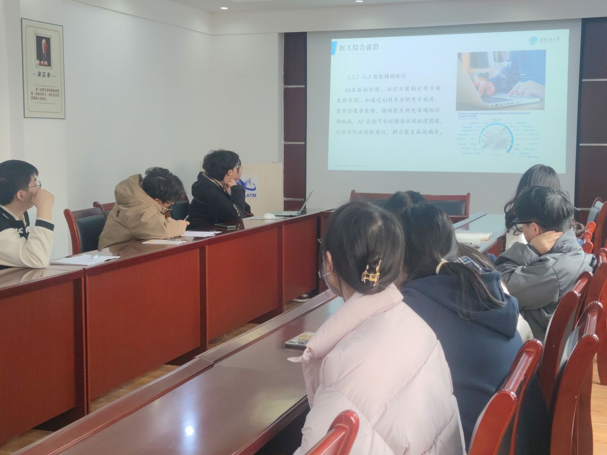 随后,研究生会综合部邓宇同学围绕“医工结合前沿知识探索之旅”展开主题分享。他从医工结合的历史脉络讲起,带大家回顾了这一领域从早期的探索起步,到逐步发展壮大,再到如今在智能医疗设备、AI辅助诊疗、精准检测技术等多个前沿领域广泛应用的发展历程。邓宇同学的分享深入浅出,让大家清晰地看到了医工结合在现实中所展现出的巨大潜力和广阔前景。