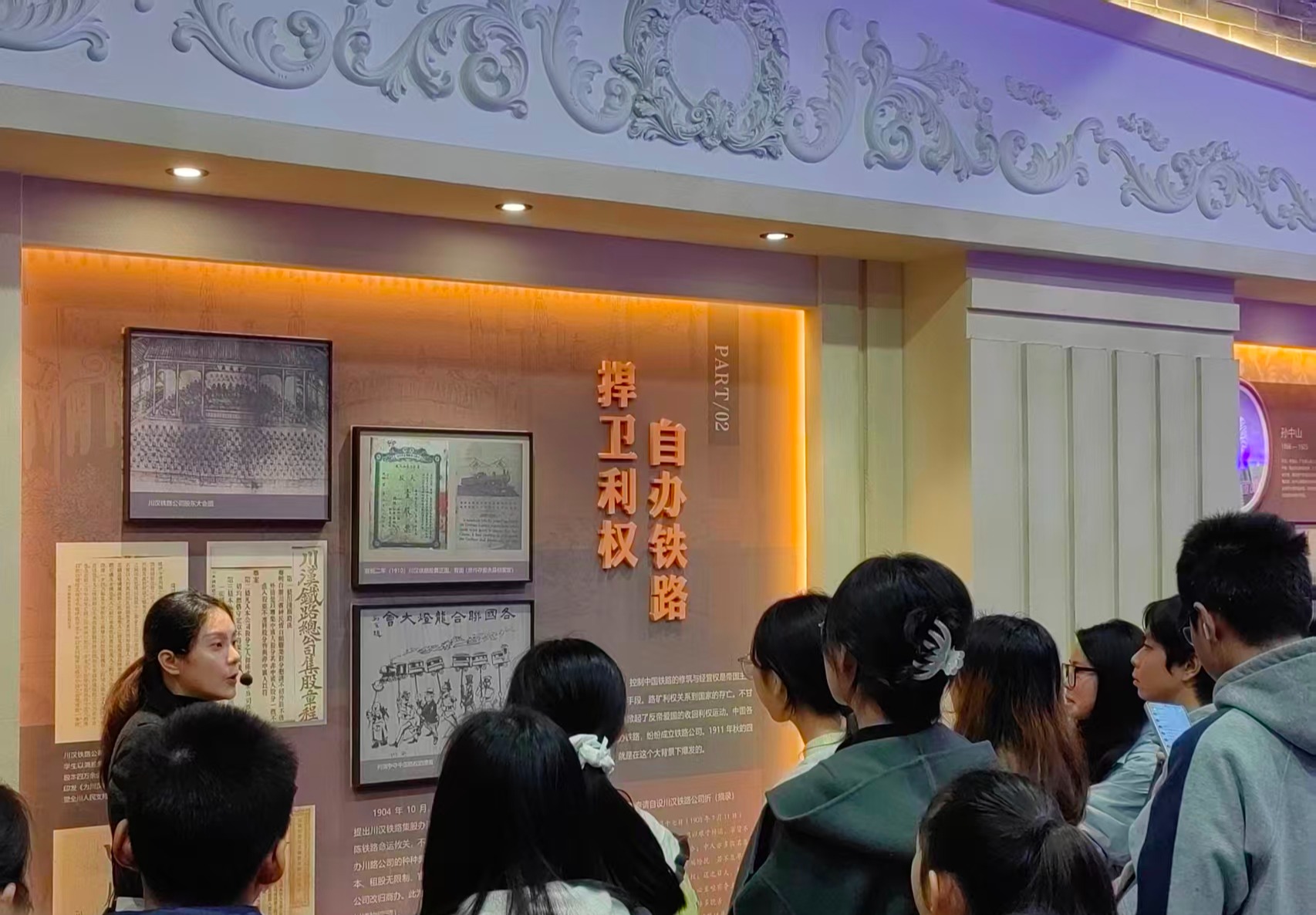 保路运动的宏大叙事,在放映厅的纪录片中凝聚为“爱国、团结、抗争”的精神内核。党员们深刻感受到,这一内核与之后抗战精神中“视死如归、宁死不屈”的民族气节血脉相通,共同铸就了中华民族的精神基座。这份感悟在“四川保路运动大事记”展区得到了具象化延伸。沿着1903至1912年的时间轴,党员们逐步梳理关键节点,在历史的潮汐中真切触摸到“历史主动精神”的磅礴力量。