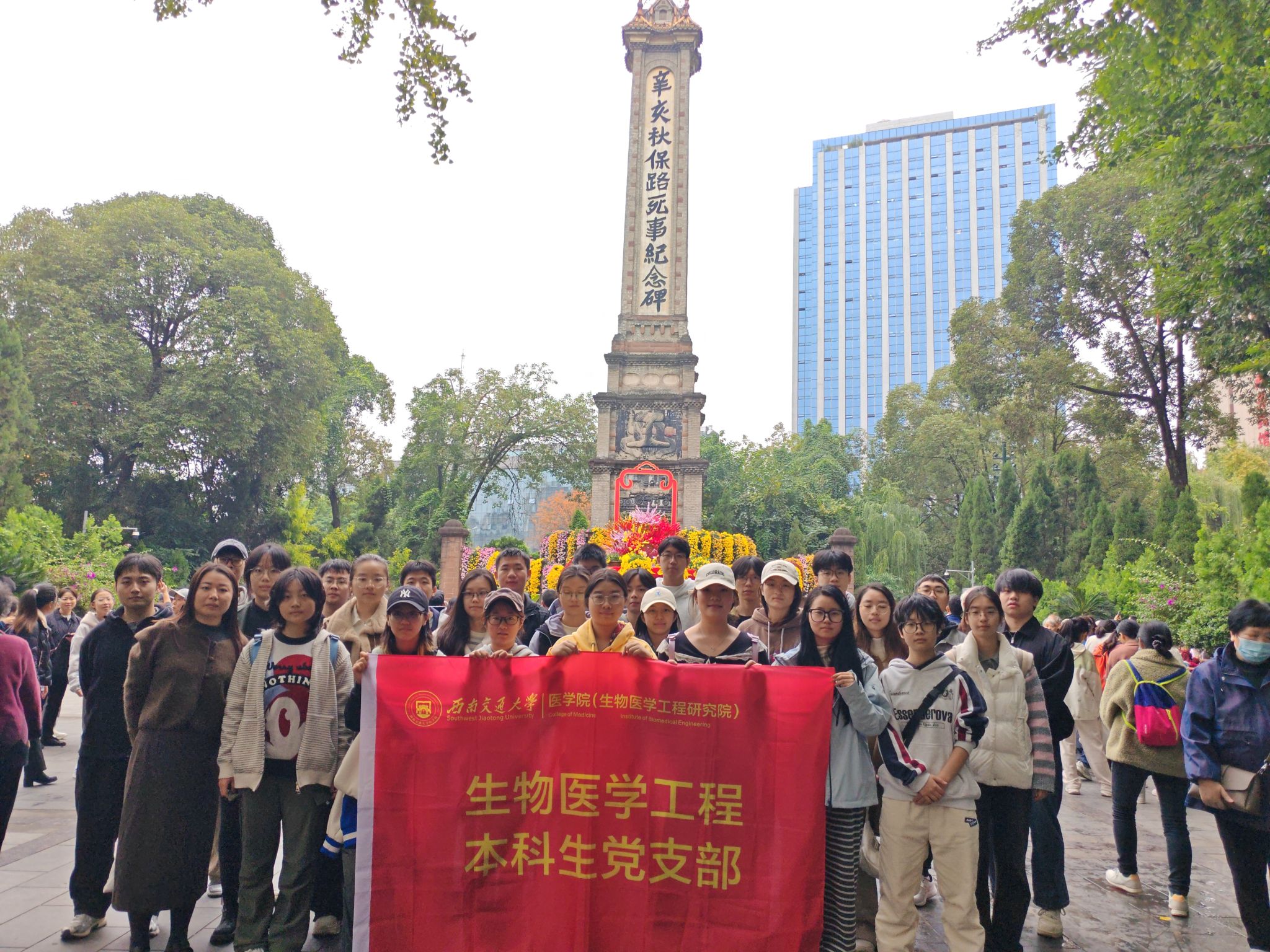 走出陈列馆,全体成员怀着肃穆的心情,列队前往辛亥秋保路死事纪念碑。这座始建于1913年的汉白玉纪念碑巍然矗立,碑身以四种字体镌刻的题记历经风雨,苍劲依旧,犹如一位沉默的见证者,无声诉说着先烈为保路权、争国权而牺牲的事迹。全体党员在碑前肃立默哀,告慰英灵。历史与现实在此刻交汇,“医工报国”的初心使命也在这一庄严仪式中得到了深刻淬炼与升华。