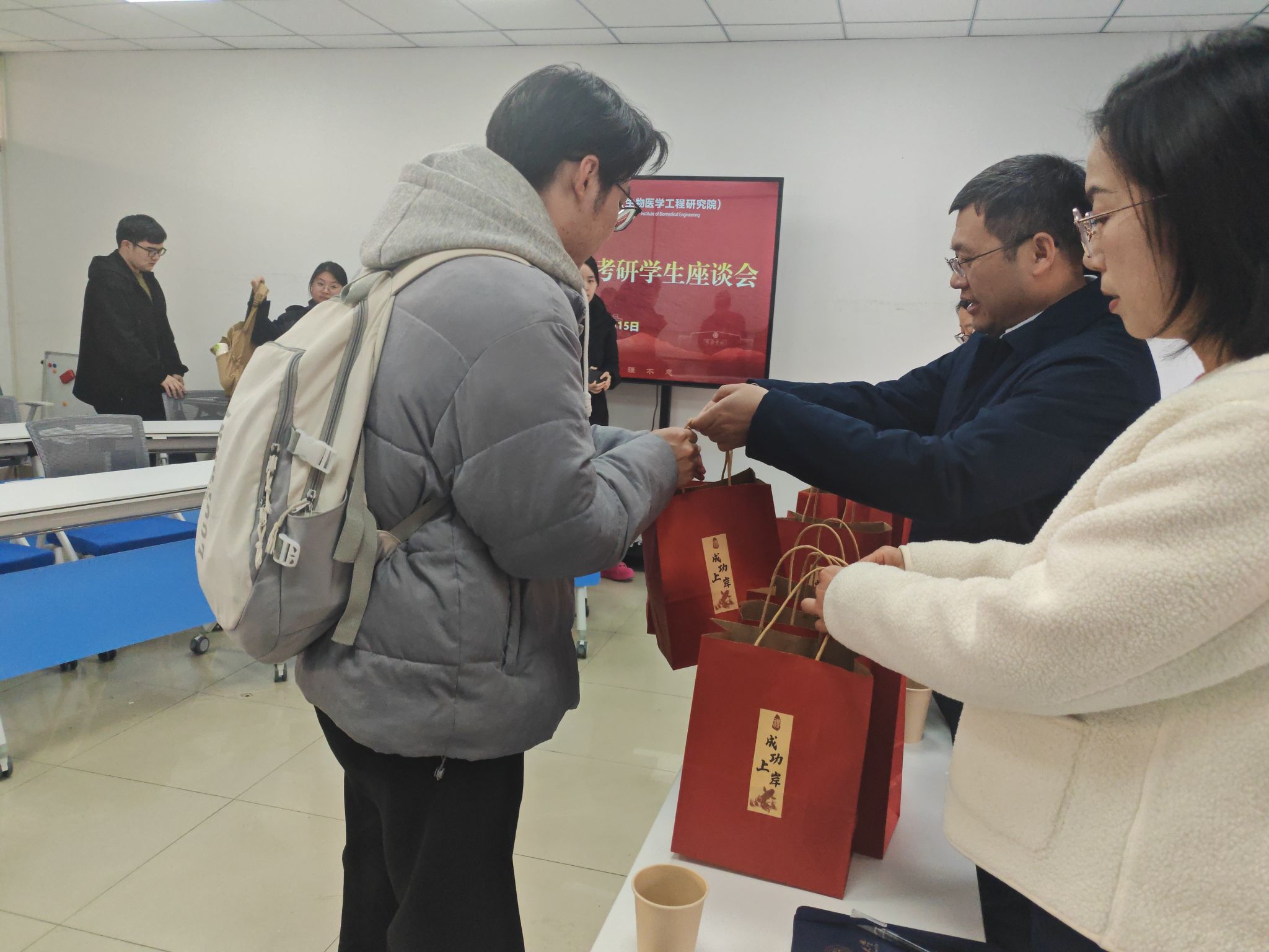 随后,与会领导、老师们亲自将学院精心准备的“考研加油包”送到每一位学子手中。“加油包”内不仅包含了寓意“金榜题名”的定制文具、“心想事橙”“分数升升”“巧克难关”“好运旺旺”的寓意食品,还有实用的暖贴等物资。每一份礼物都凝聚着学院对学子们的深切关怀与殷切期望,现场气氛温馨而热烈。