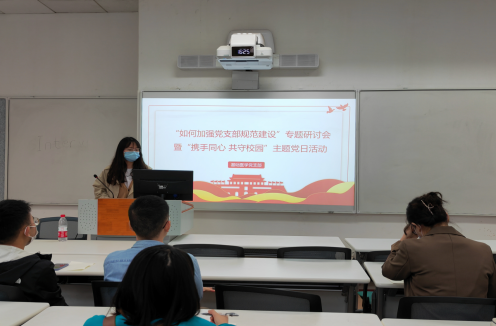 为了进一步推进党支部标准化规范化建设工作,推动学院党建高质量发展,同时更好落实上级疫情防控要求,确保校园安全稳定,4月14日下午,基础医学党支部在九里校区逸夫馆4118召开了“如何加强党支部规范建设”专题研讨会暨“携手同心 共守校园”主题党日活动,会议采取线上线下相结合的方式,由党支部书记李双芹主持,支部全体党员参加了此次会议。