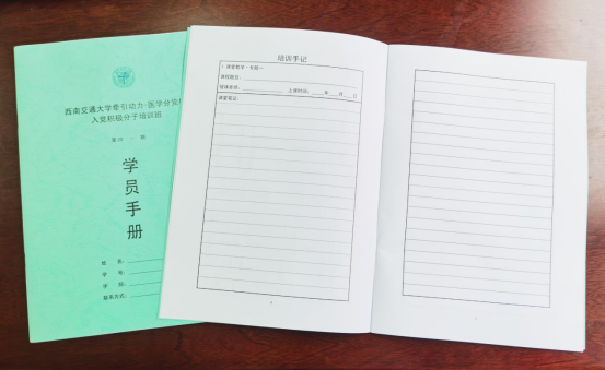 本次培训,分党校专门设计制作了《牵引动力-医学分党校入党积极分子培训班学员手册》,手册除具有签到功能外,还为学员们设计了每一节课程笔记记录、撰写心得、实践总结的板块。希望学员们努力学习、认真记录每次课程的心得体会,从参加入党积极分子培训开始以党员的标准严格要求自己。