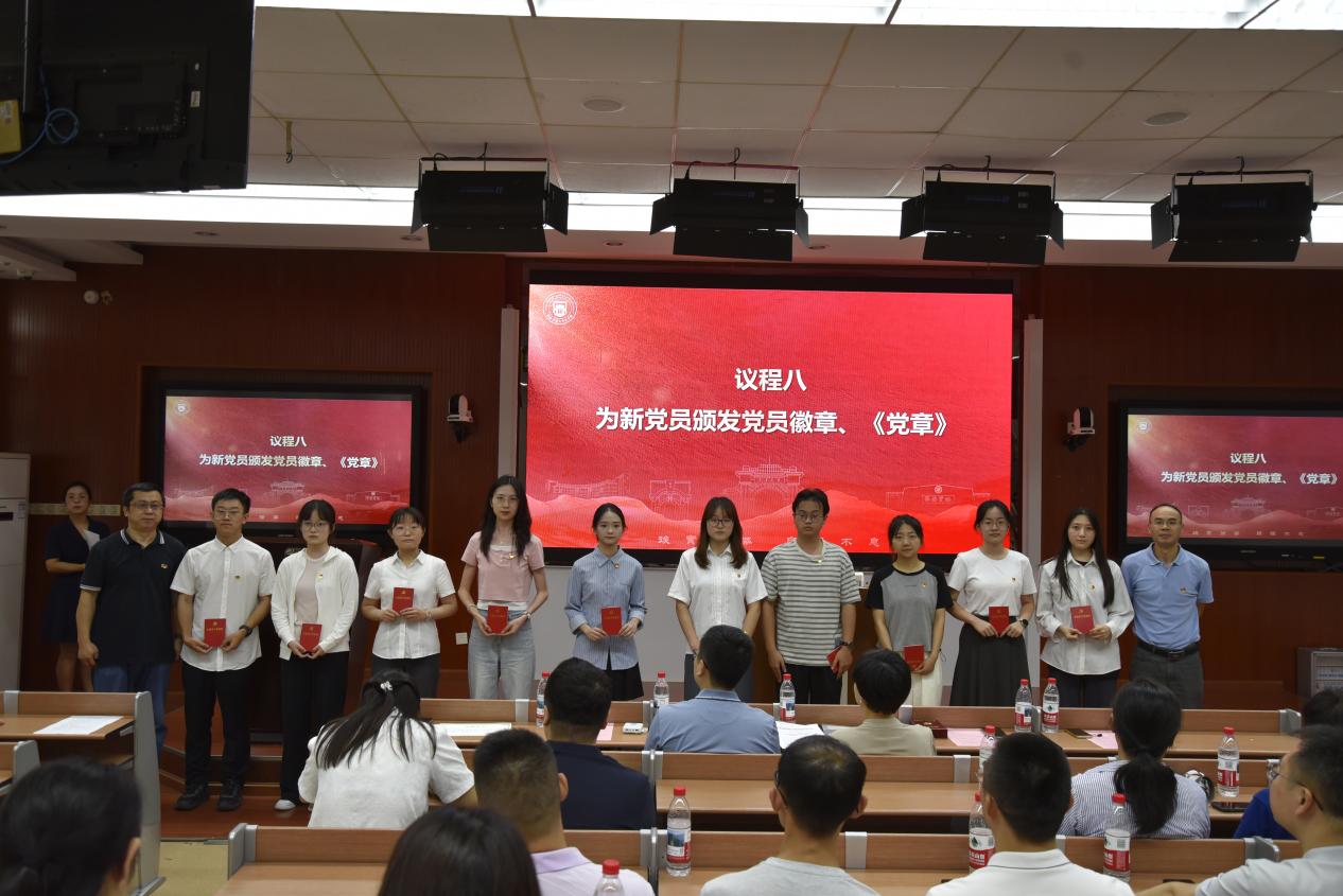 委员会关于同意接收预备党员的批复》,冷永祥、万国江两位在党三十年的老党员同志为新党员佩戴党员徽章并颁发《中国共产党章程》。