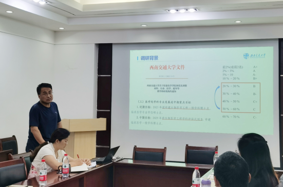 周绍兵院长介绍了《健康中国建设视野下生物医学工程学科发展趋势及学院发展策略》调研课题,院长助理郭泰林补充介绍了关于生物医学工程学科建设中的关键数据分析。