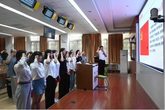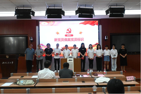 委员会关于同意接收预备党员的批复》。孙鸿、屈树新两位在党三十年的老党员同志一一为新党员们佩戴了党徽并颁发党章。李锦红书记为大家解读了入党誓词的深刻内涵,并带领全体党员面对党旗进行了庄严宣誓。
