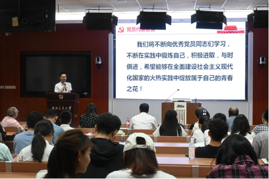 最后,党员代表刘军豪同志作“履行党员义务,争做先锋模范”表态发言,他代表全体党员庄严承诺,要做思想上、学业上、服务上、生活上的先锋,并将不断向优秀党员同志们学习,不断在实践中锻炼自己,积极进取,与时俱进,希望能够在全面建设社会主义现代化国家的火热实践中绽放属于自己的青春之花。