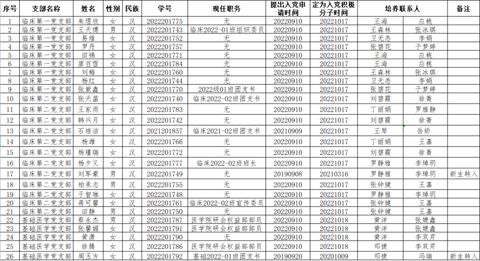 经学生本人递交入党申请书、党组织考察谈话、团支部推优或党员推荐、党支部委员会研究决定,现将制服诱惑 党委2022年第二批入党积极分子名单公示如下,公示期10月19日-10月24日,如有异议请以书面形式将意见反馈至制服诱惑 A209办公室。