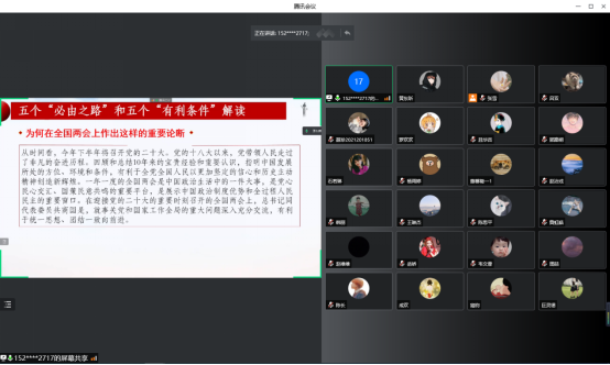 2022年4月1日晚,因疫情防控原因,临床第二党支部于线上召开了“用好有利条件,走好必由之路”两会精神专题学习会。会议的主要内容是学习习近平总书记在“两会团组时间”提出的两个重要论断。本次学习由党支部书记张雪同志主持,吴俊同志领学,支部全体党员和入党积极分子参加。