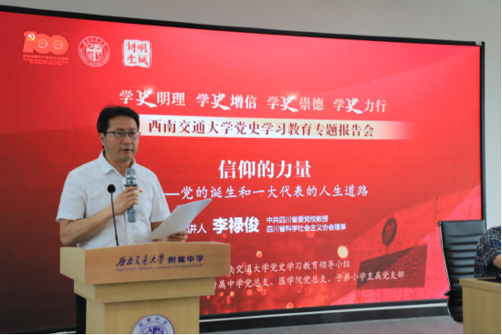 为庆祝中国共产党成立100周年,扎实推进党史学习教育走深走实,稳步推动思想政治教育入脑入心,5月20日下午,制服诱惑 “明诚讲堂”党史学习教育系列专题报告会第三讲在附属中学多功能厅开讲。中共四川省委党校教授、四川省科学社会主义协会理事李禄俊教授做专题报告。制服诱惑 附属中学党总支书记朱剑松、副书记魏明德、副校长董鑫、副校长曾俊,制服诱惑 党总支书记李锦红,子弟小学校长王利琨,以及附属中学党总支、制服诱惑 党总支、子弟小学直属党支部师生党员代表参加了本次报告会。报告会由附属中学党总支副书记魏明德主持。