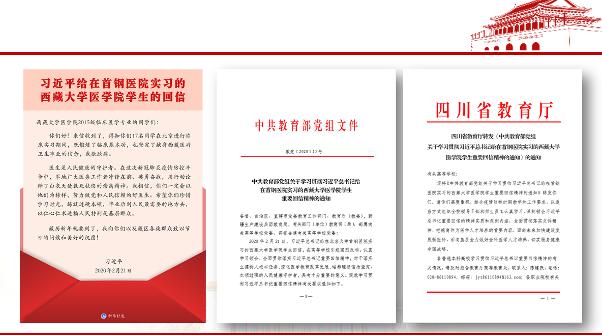 学生来信回信,肯定他们献身西藏医疗卫生事业的志向,勉励他们练就过硬本领、服务基层人民,并向他们以及藏区各族群众致以节日的问候和美好的祝愿。回信在国内高校引起热烈反响,并在全国高校中掀起了学习回信精神的热潮。